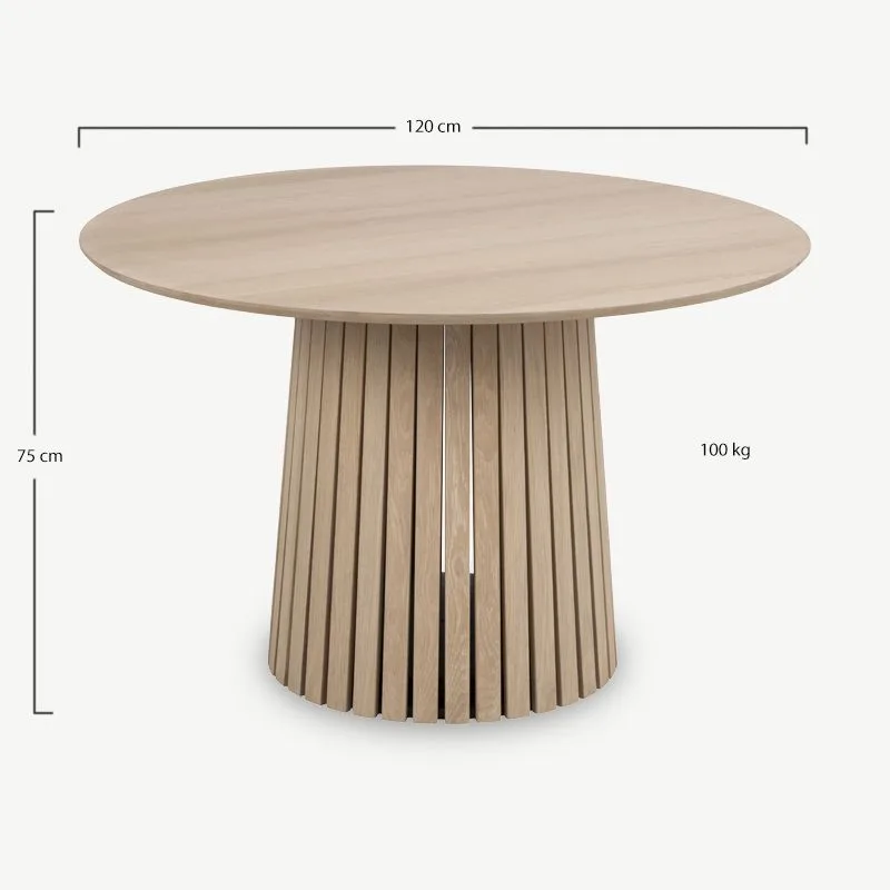 Ümmargune söögilaud Lazaro, mille läbimõõt on 120 cm, pakub elegantset ja kutsuvat disaini, mis sobib ideaalselt Skandinaavia stiilis interjööridesse. Selle valge pigmenteeritud tammepuidust spoon annab lauale kerge ja naturaalse ilme, tehes sellest mitmekülgse keskpunkti igasse söögituppa.