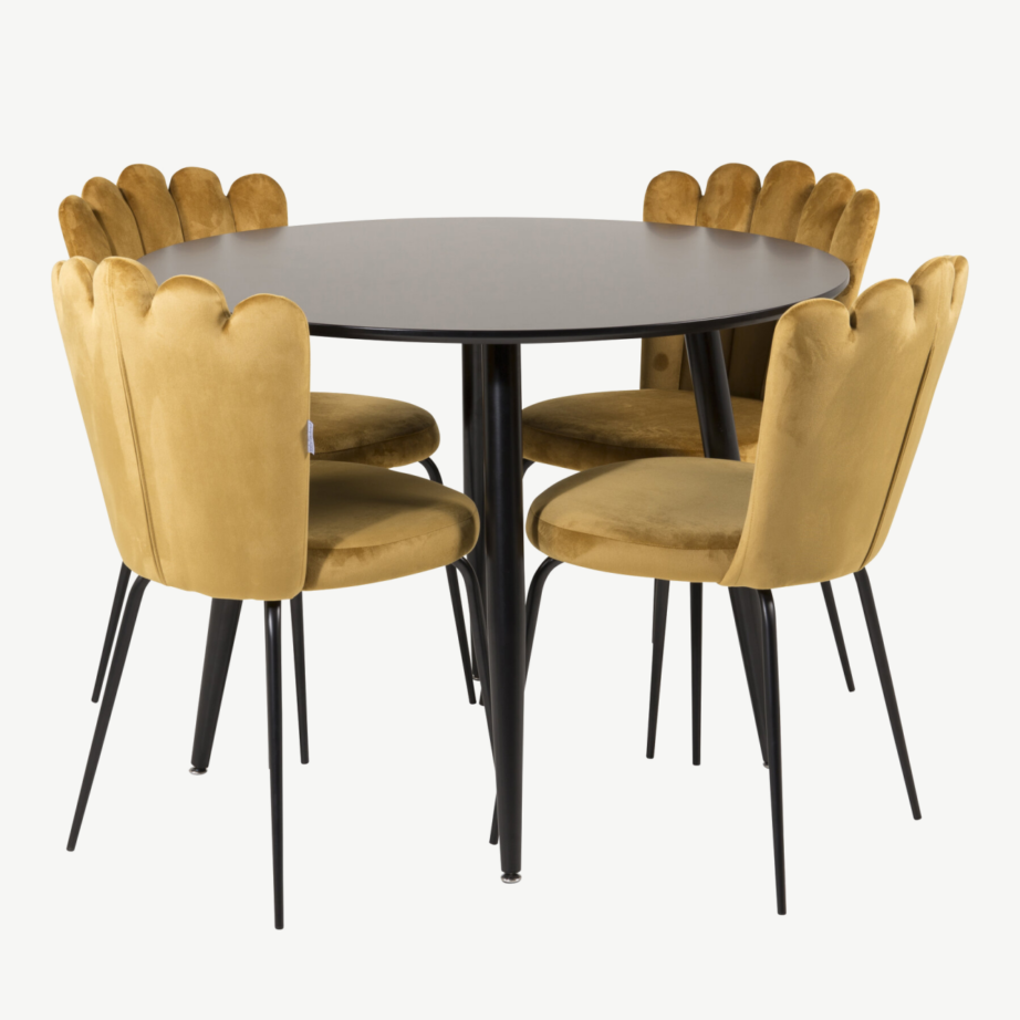 Komplekti kuulub: 1 ümmargune musta MDF-plaadiga Plaza söögilaud (teraste jalad) ja 4 Limhamn tooli (kollane sametkangas, mustad terasjalad). Tootekood: GR24133.