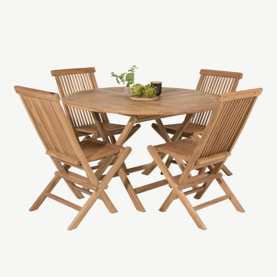 - Komplektis: ümmargune laud ja neli kokkupandavat tooli (ilma käetugedeta)