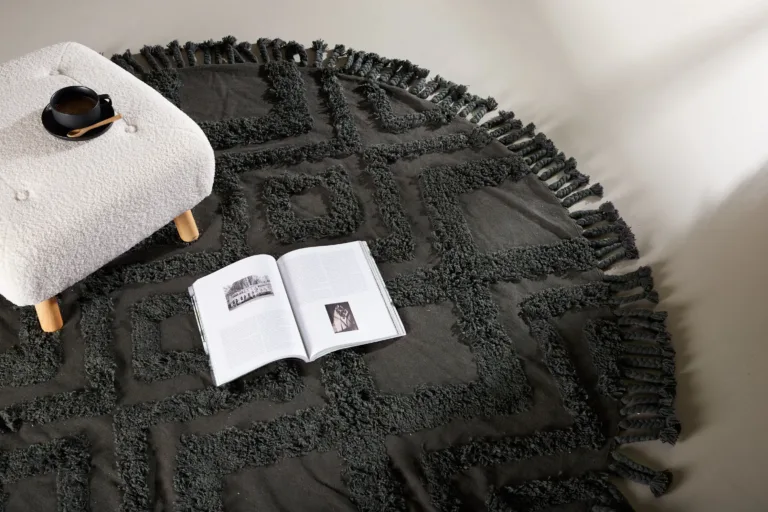 Lisa oma koju põhjamaist elegantsi Hilma kollektsiooni ümmarguse tumehalli vaibaga! See suur, 200 cm läbimõõduga vaip on valmistatud 100% puhtast puuvillast, pakkudes nii vastupidavust kui ka mugavat pehmust jalge all. Tegemist on ideaalse valikuga nii elutuppa, magamistuppa kui ka söögilaua alla, et tuua ruumi kaasaegset stiili ja hubasust.