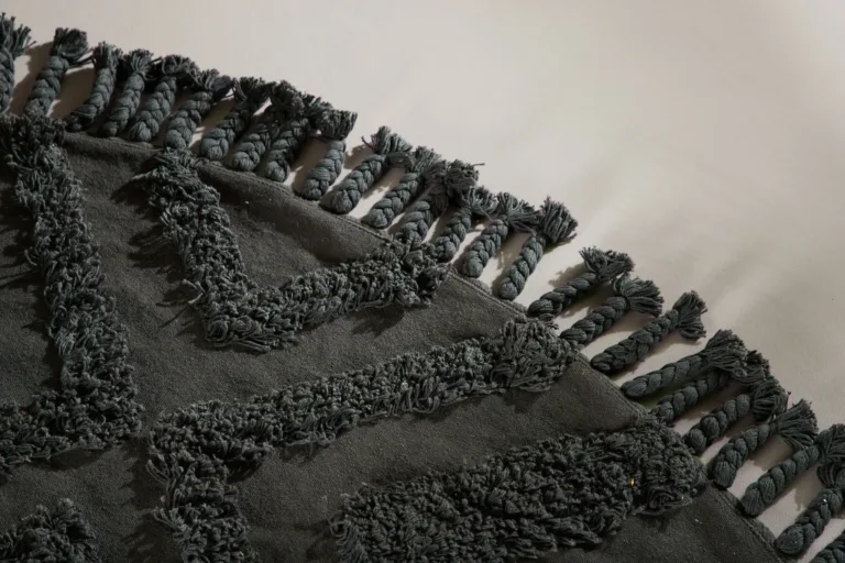 - Unikaalne disain: Tumehall toon koos tuftitud mustriga annab vaibale visuaalset sügavust ning tekstuuri.