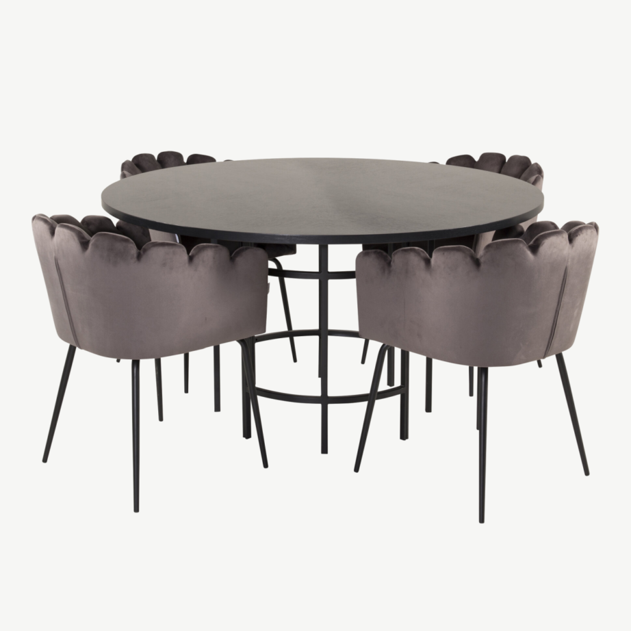 - Hallid sametist söögitoolid: Komplektis on viis Limhamn-seeria õrna halli sametkattega tooli. Pehme polsterdus, ergonoomiline seljatugi ja kvaliteetsed terasjalad pakuvad oivalist istumismugavust. Toolide südajas kuju ja luksuslik velvetkate annavad ruumile erilise aktsendi.