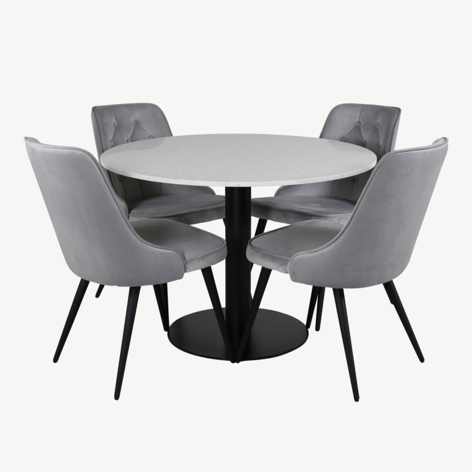 - Komplektis: ümmargune valge terazzolauaplaat, must metallraam, üksikud Velvet Deluxe toolid (helehall polüesterkattega, mustad metalljalad).