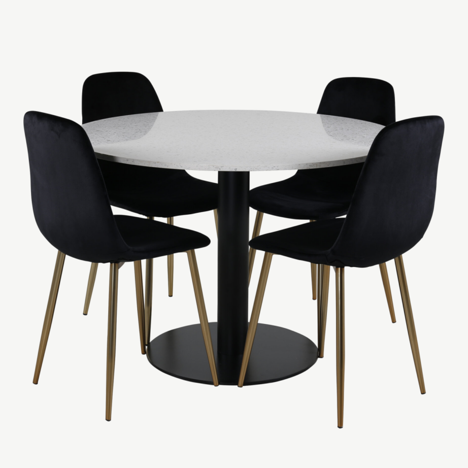 Razzia söögilaua komplekt loob Sinu koju ajatu põhjamaiselt stiilse ja hubase atmosfääri. Komplekt koosneb ümmargusest valge terrazzo lauaplaadiga lauast ning neljast eksklusiivse musta sametkattega söögitoolist Polar sarjast, mida täiustavad mattkuldse viimistlusega metalljalad. See disainmööbli lahendus ühendab modernsuse ning mugavuse, tuues esile põhjamaisele koju iseloomuliku puhta ja luksusliku joone.