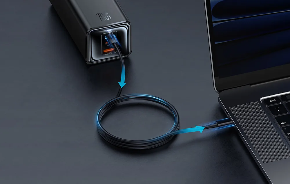 Kompaktne must GaN pikendusjuhe külgvaates töölaual