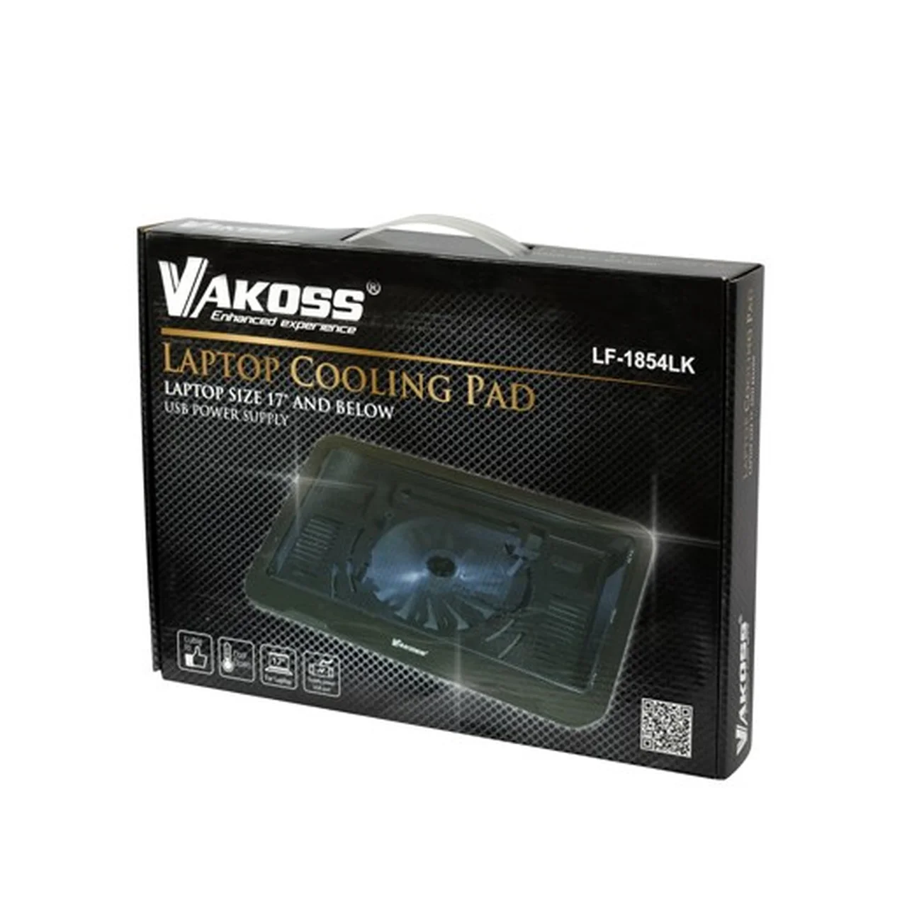 Vakoss LF-1854LK on must USB-toitega sülearvuti jahutusalus, millel on sinise LED-valgustusega 15,5 cm ventilaator ning sobib kuni 17-tollistele seadmetele.
