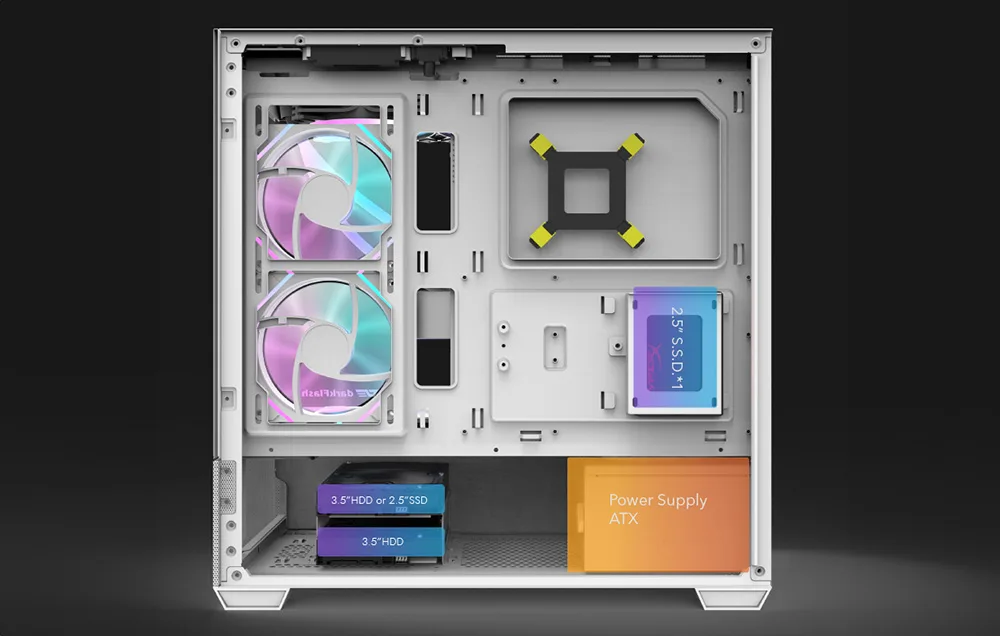Korpus toetab ATX, M-ATX ja ITX emaplaate ning pakub seitset laienduspesa. Sobilikud on kuni 425 mm pikkused graafikakaardid ja kuni 170 mm kõrgused jahutid. Toiteploki alumine asetus lihtsustab kaablite korraldamist. Valge arvutikorpus pakub suurepärast kombinatsiooni funktsionaalsusest ja huvitavast disainist tänapäevasesse kontorisse või mängutoasüsteemi.