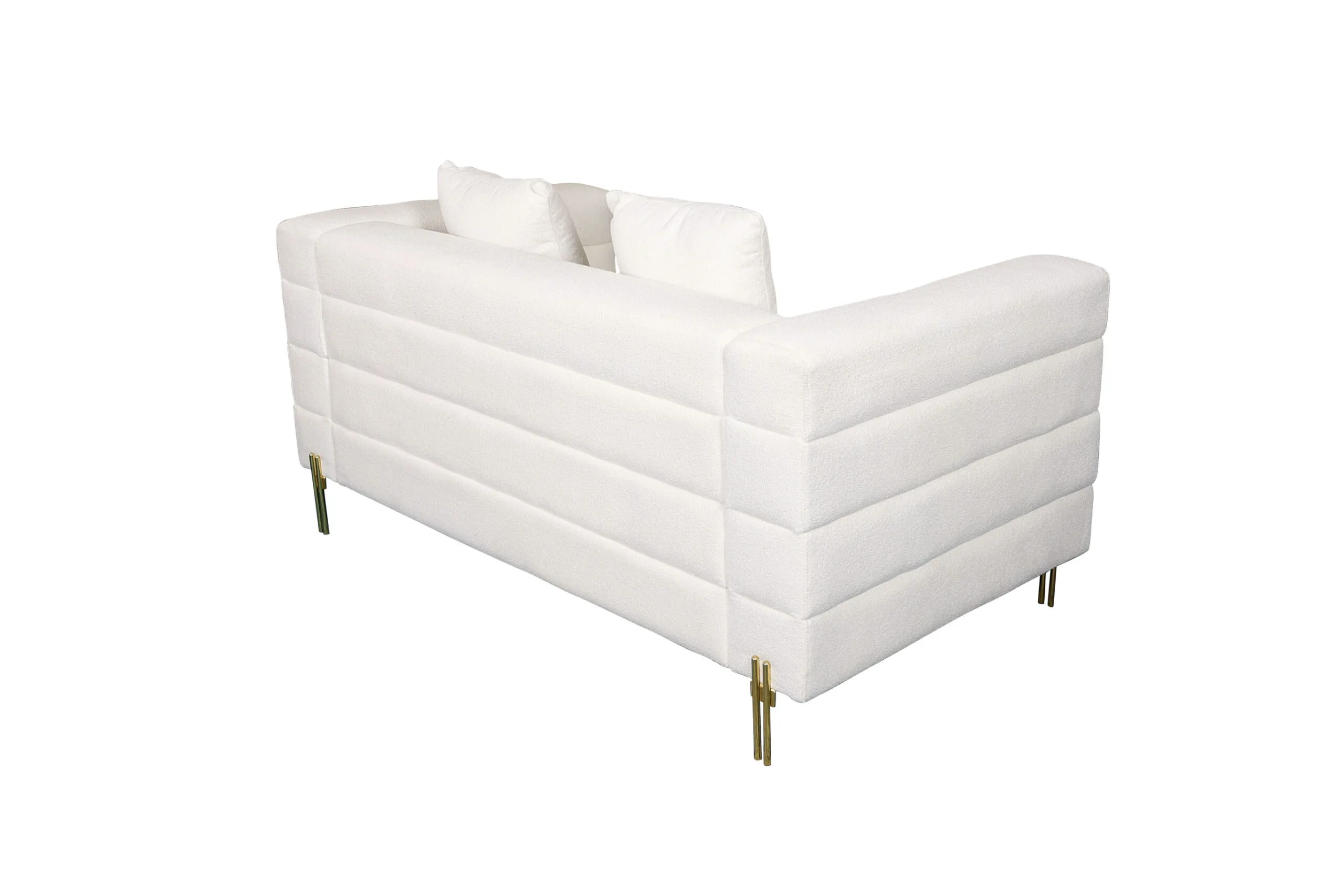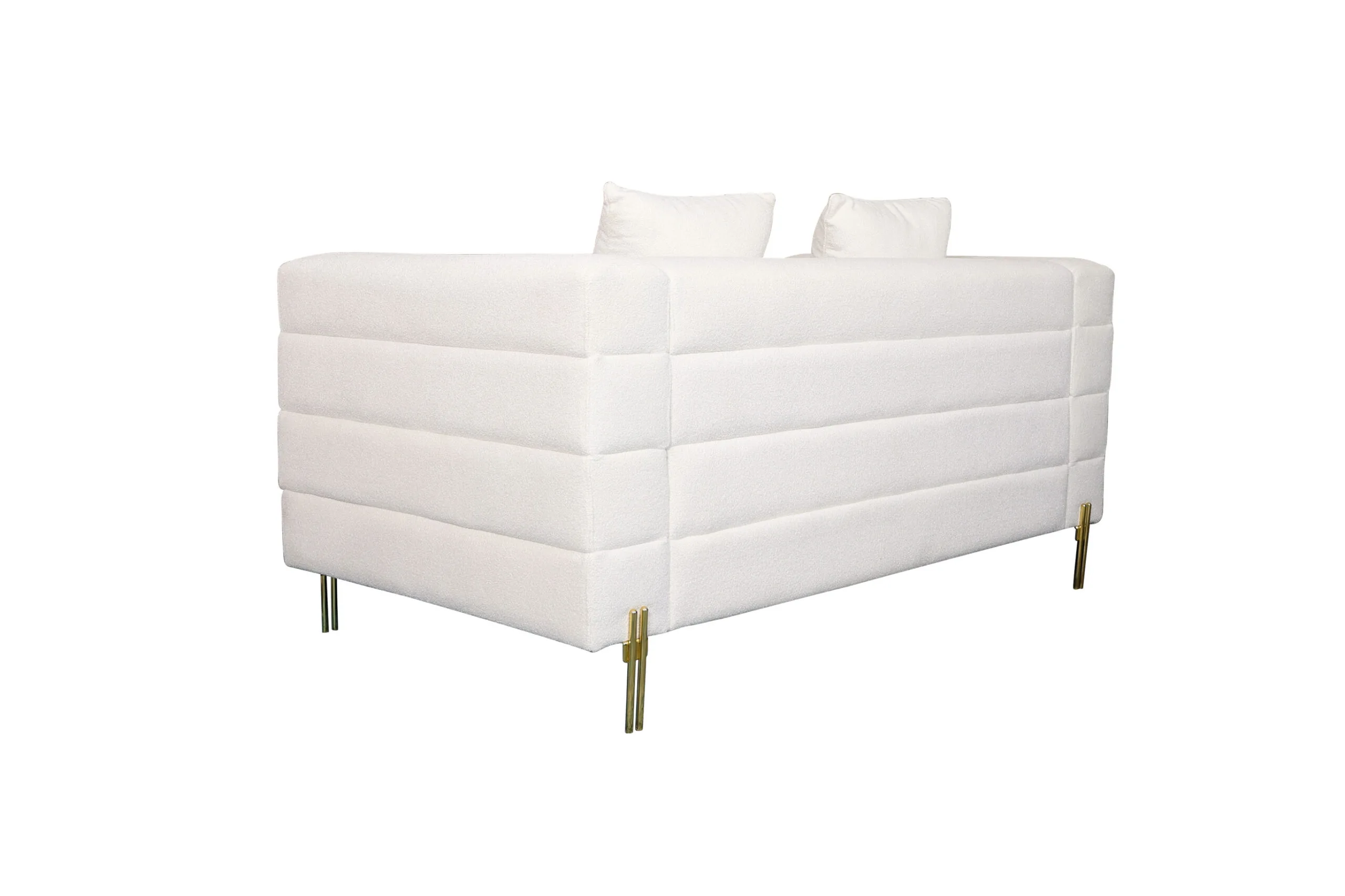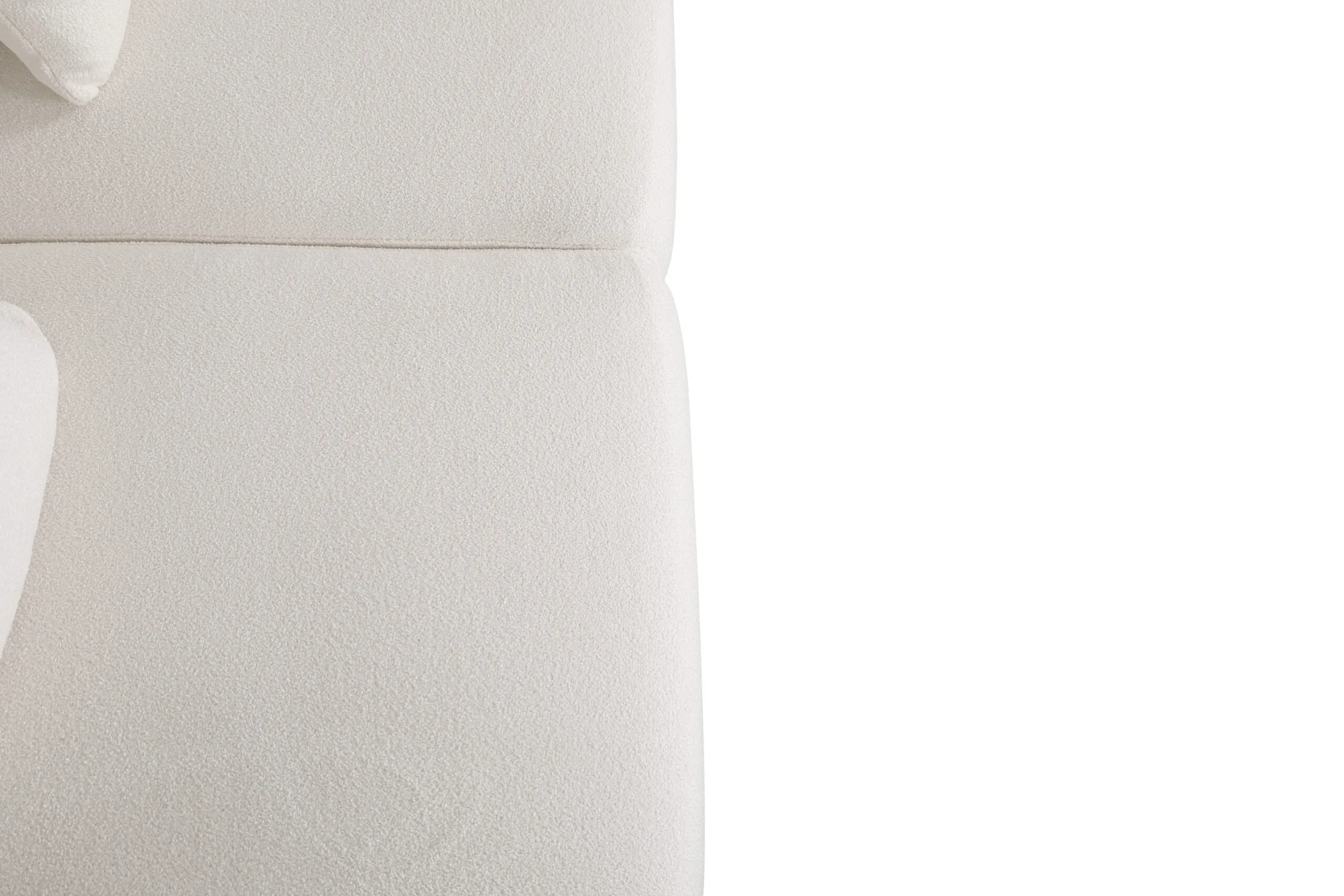 Nua N49-1 diivan elutuppa. See elegantne kaheistmeline diivan on kaetud moeka valge ecru boucle kangaga ning toetub kuldse tooniga roostevabast terasest jalgadele. Klassikalist kuju täiendab kõrgekvaliteetne, pehme kangas ja horisontaalne õmblus, pakkudes nii mugavust kui ka stiili igasse elutuppa.