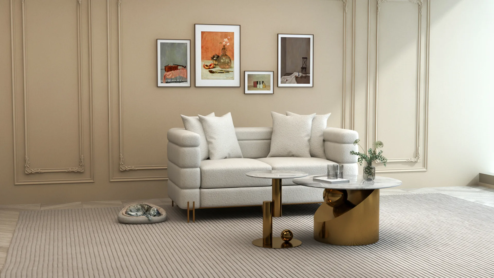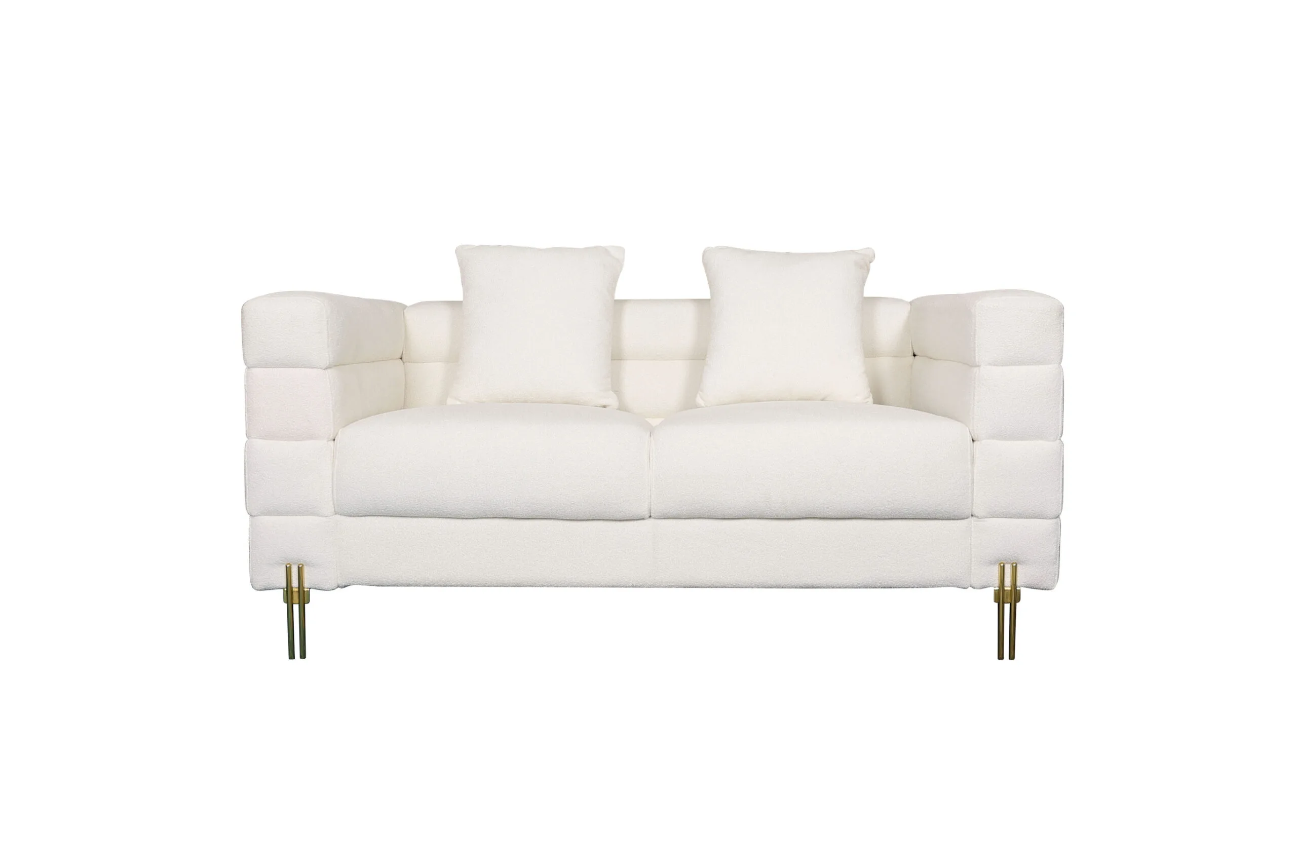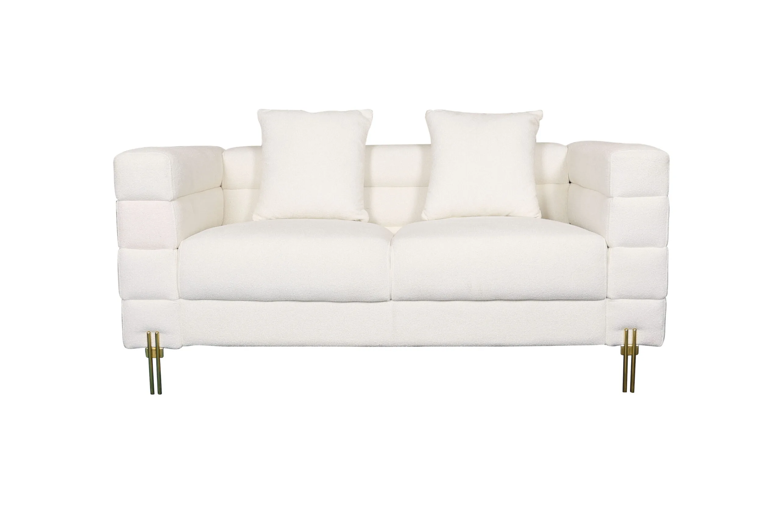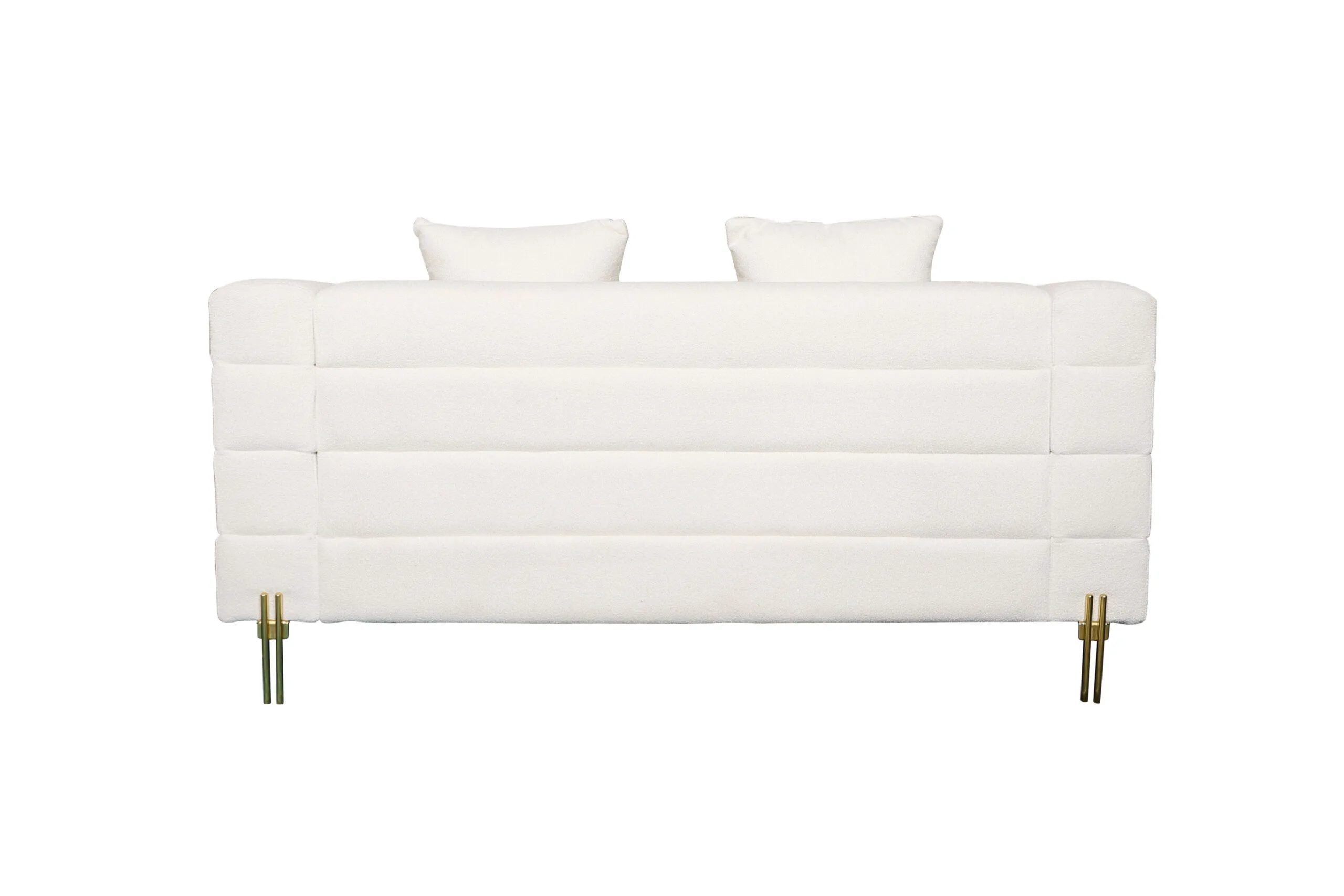 Nua N49-1 diivan elutuppa. See elegantne kaheistmeline diivan on kaetud moeka valge ecru boucle kangaga ning toetub kuldse tooniga roostevabast terasest jalgadele. Klassikalist kuju täiendab kõrgekvaliteetne, pehme kangas ja horisontaalne õmblus, pakkudes nii mugavust kui ka stiili igasse elutuppa.