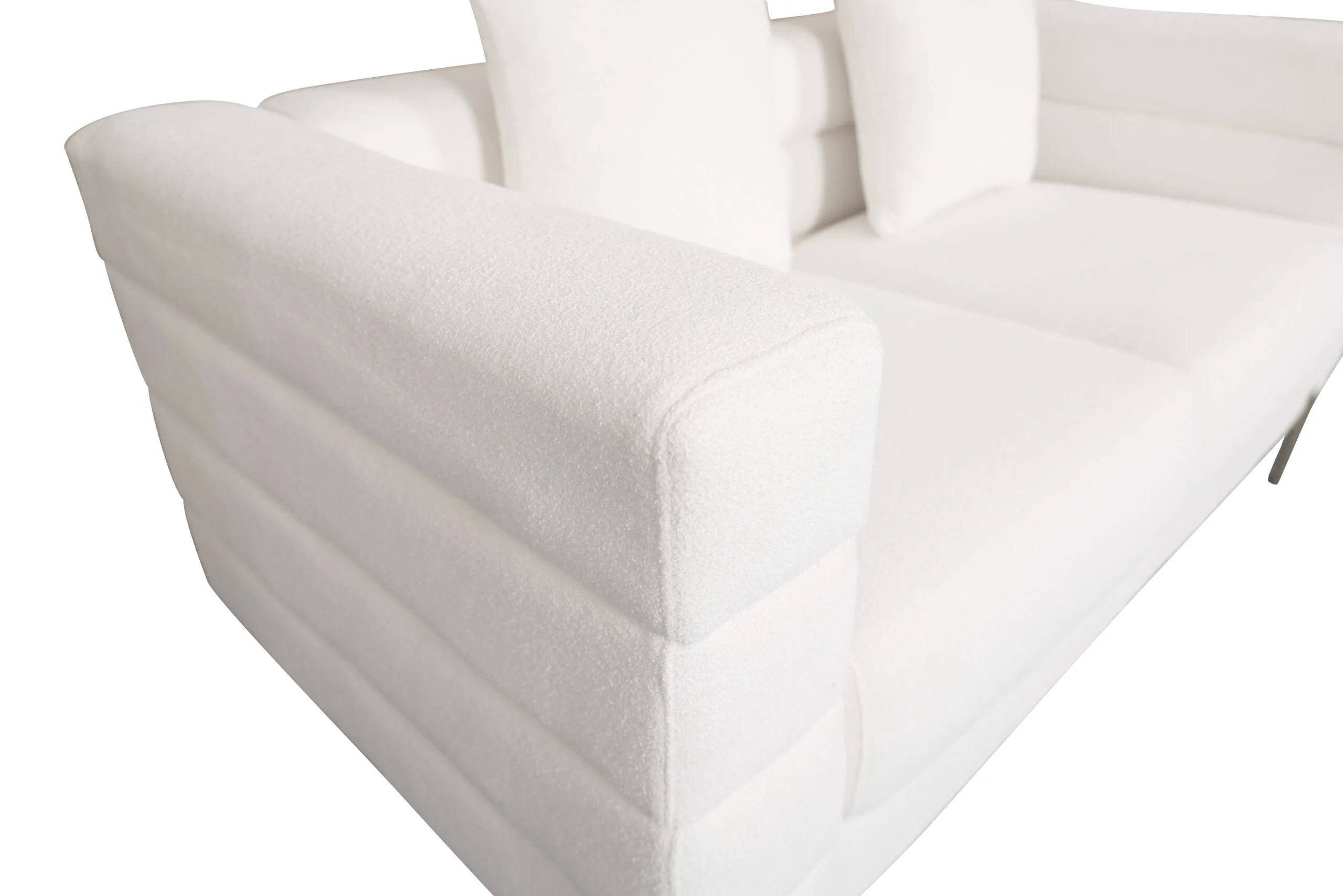 Diivani eripäraks on selle luksuslik boucle kangas, mis sisaldab hõbedast niiti, lisades peene sära ja tekstuuri. Komplekti kuuluvad padjad loovad lisamugavust ja võimaldavad luua hubase atmosfääri. Kokkupandud, ei vaja paigaldust, säästes teie aega ja vaeva.