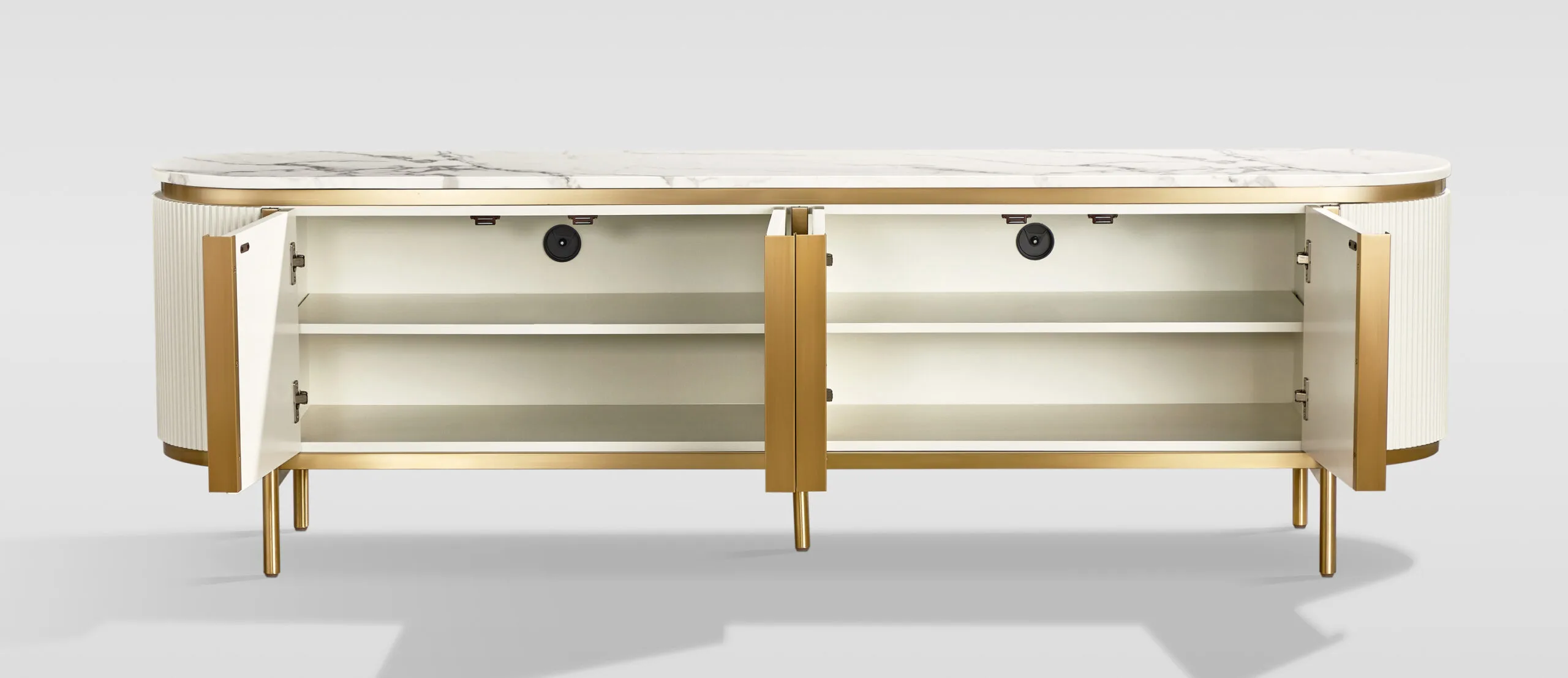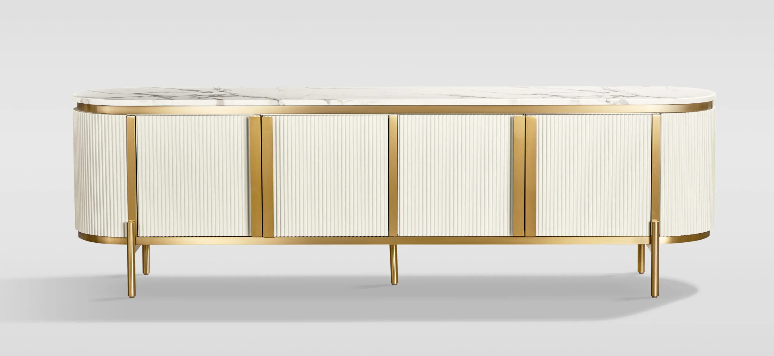 Stilig kollektsiooni ST382C TV-alus on valmistatud roostevabast terasest, MDF-ist ja marmorist, mis tagavad vastupidavuse ja pikaealisuse. Neli ust ja kaks reguleeritavat riiulit pakuvad piisavalt ruumi meediaseadmete ja muude esemete hoidmiseks. Pehmed sulgemismehhanismid ja reguleeritavad jalad lisavad kasutusmugavust. Metallist käepidemed ja roostevabast terasest detailid annavad sellele mööbliesemele kaasaegse ja elegantse ilme.