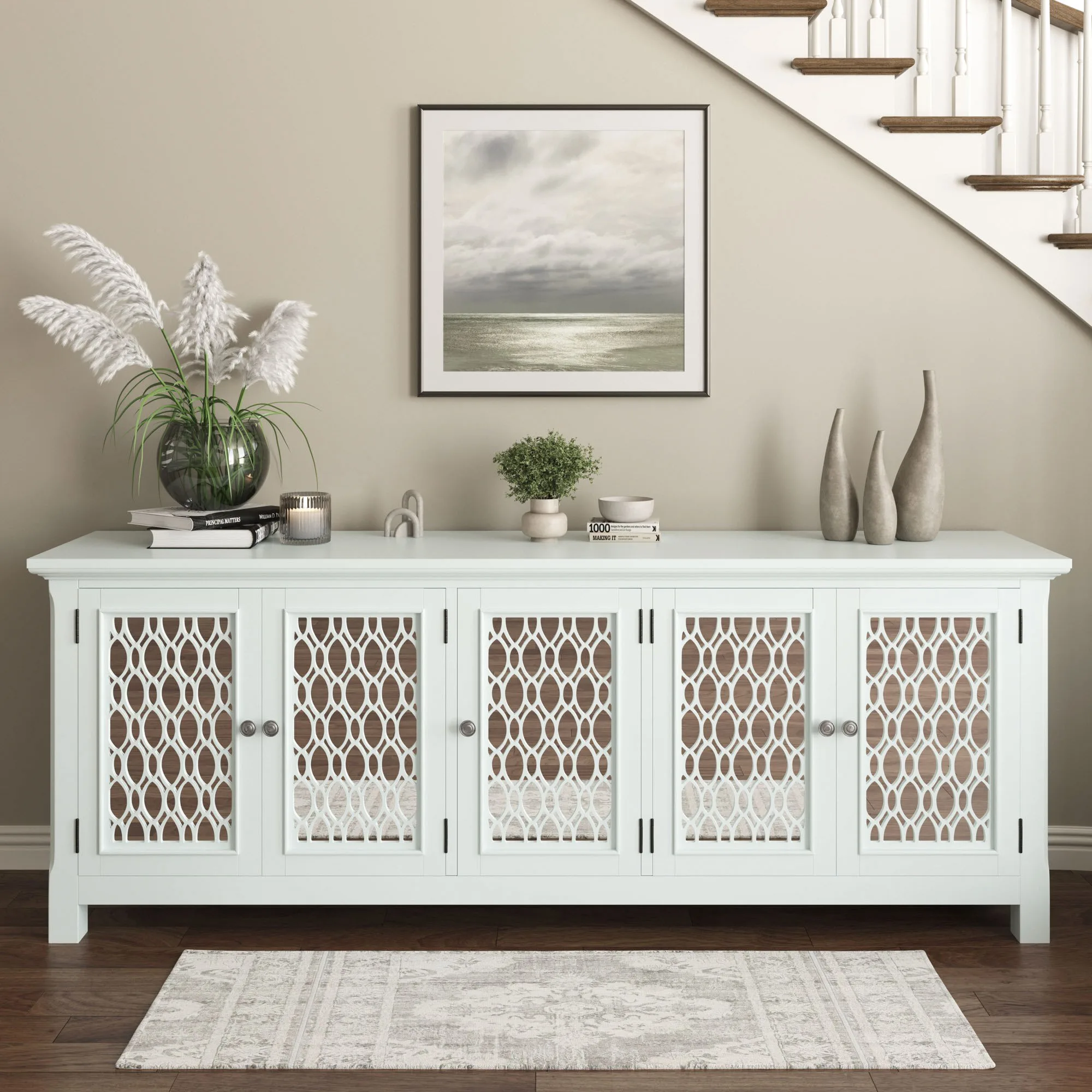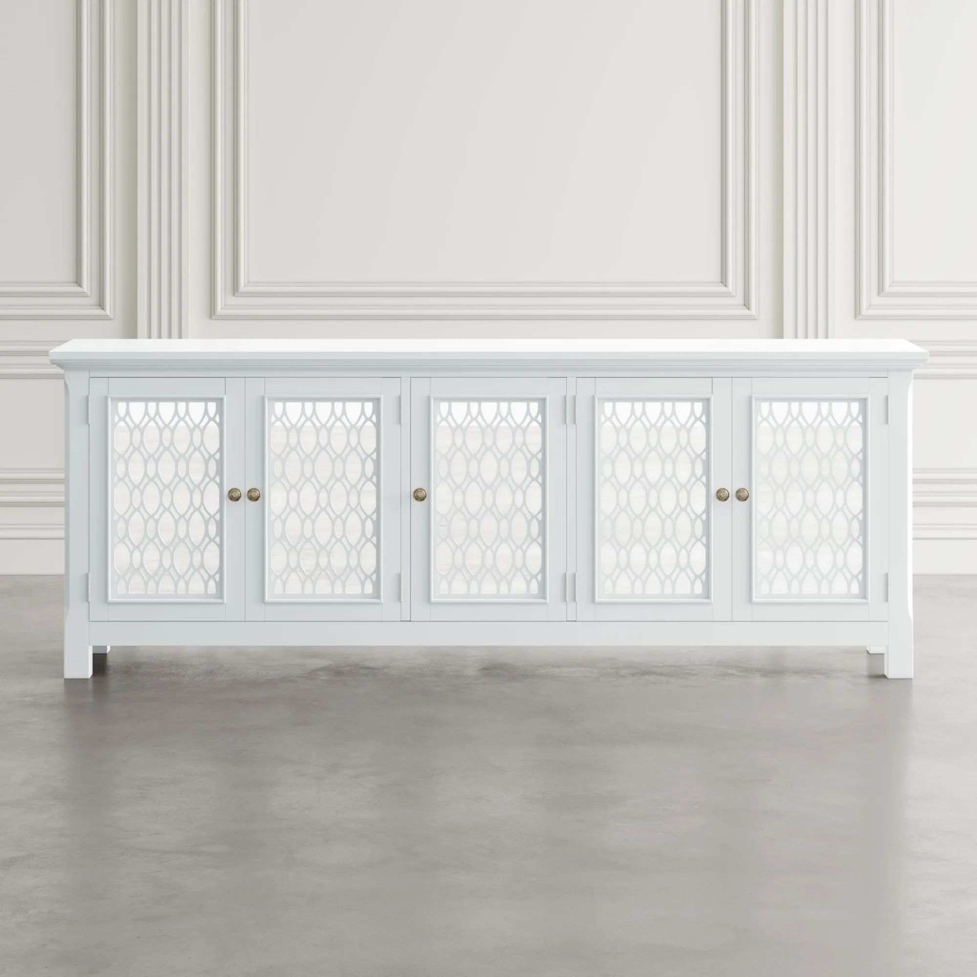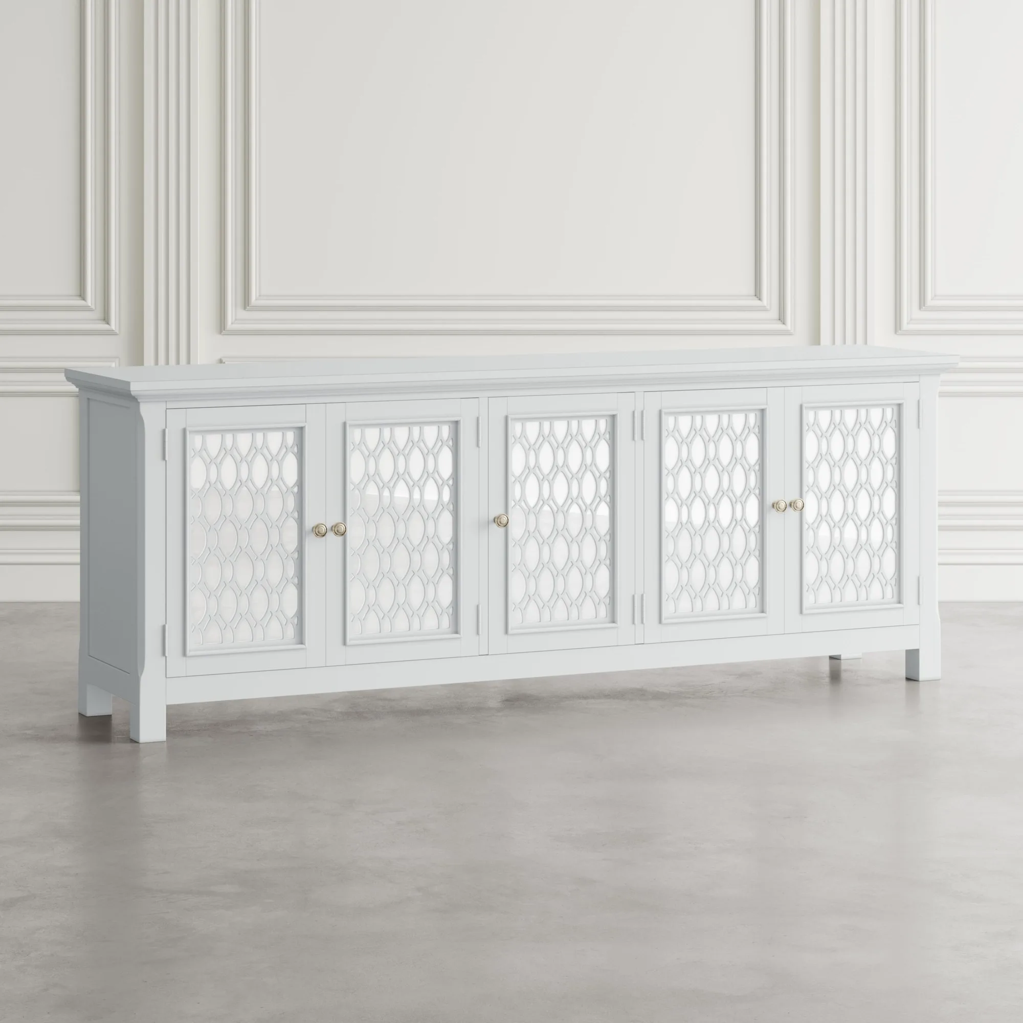 Kummuti viie ukse taga peituvad kolm reguleeritavat riiulit, mis võimaldavad paindlikku hoiustamist. Peegeldustega uksed lisavad valguse mängu ja avarust, samas kui metallist käepidemed annavad modernse viimistluse. Kummuti mõõtmed on 218,5 cm lai, 48,5 cm sügav ja 81,5 cm kõrge, pakkudes piisavalt ruumi nii praktiliseks kasutuseks kui ka dekoratiivsete esemete esitlemiseks.