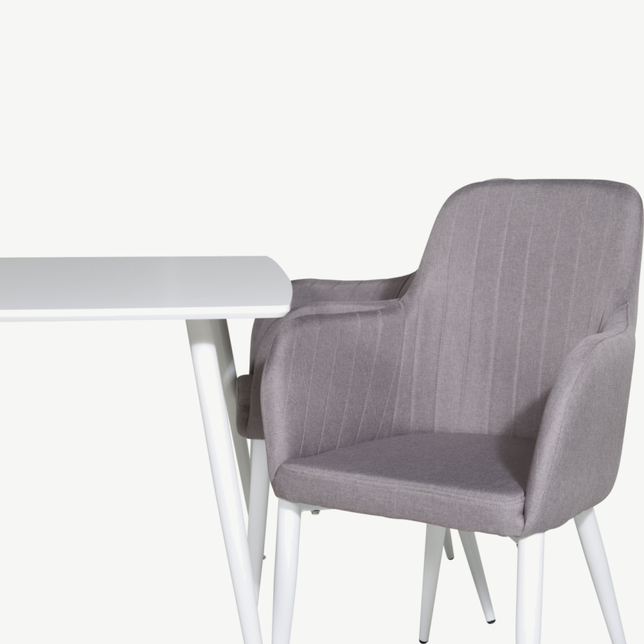 Lauaplaat on valmistatud tugevast MDF-ist ning viimistletud kauakestva valge värvkattega. Pulbervärvitud terasest lauajalad tagavad stabiilsuse ja pika eluea. Hallid Comfort toolid on kaetud allergikutele sobiliku polüesterlinase kangaga, mis on vastupidav ja lihtsasti hooldatav. Pehme polsterdus ja ergonoomiline seljatugi muudavad istumise meeldivaks ka pikemal söögikorral.