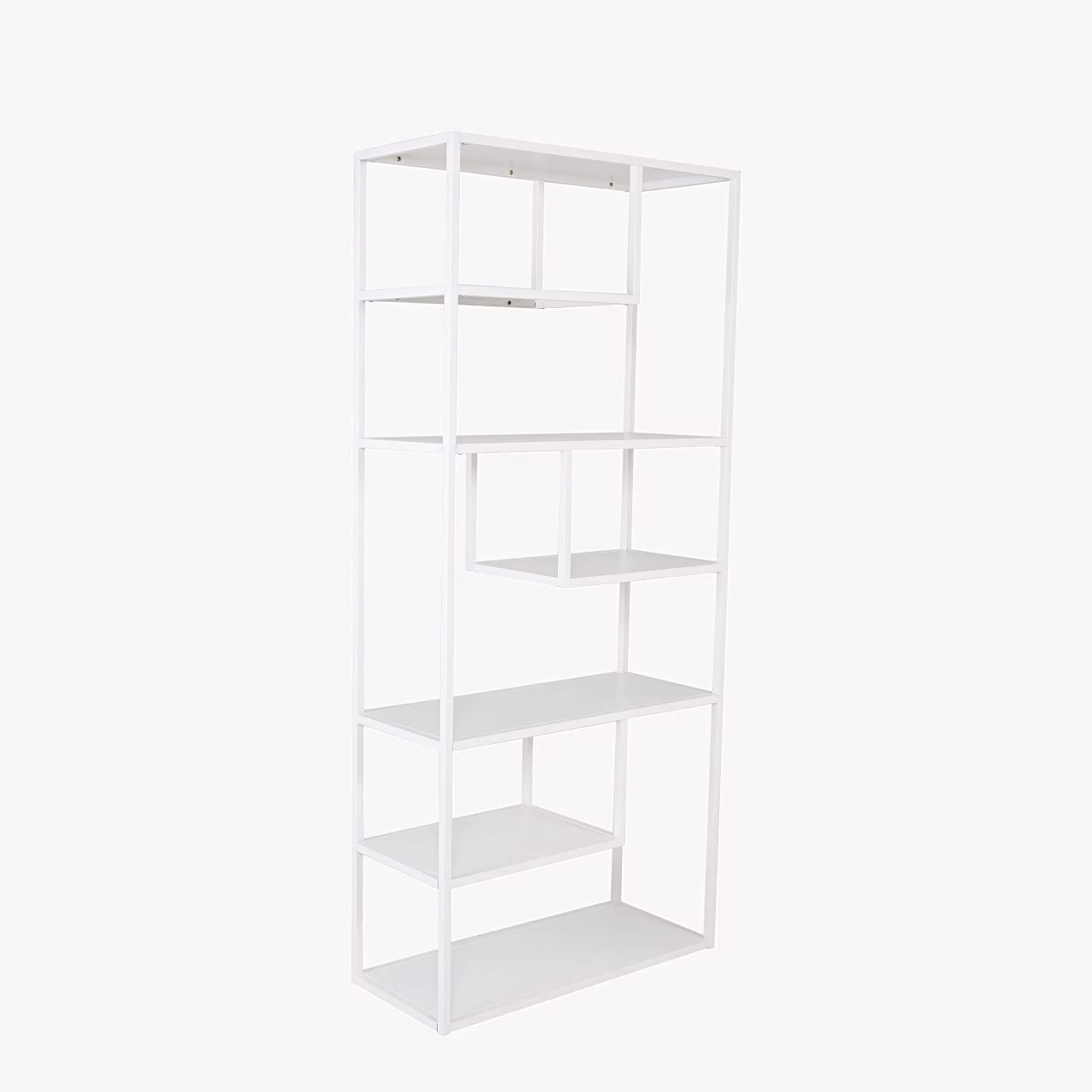 Stiilne valge raamaturiiul Staal loob avatud ja õhulise hoiulahenduse sinu elutuppa
