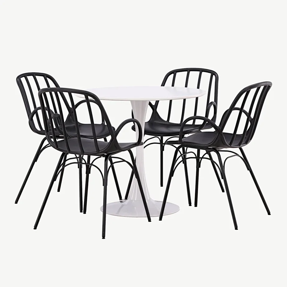 Valge ümmargune söögilauakomplekt Hamden ja neli musta Dyrön tooli
