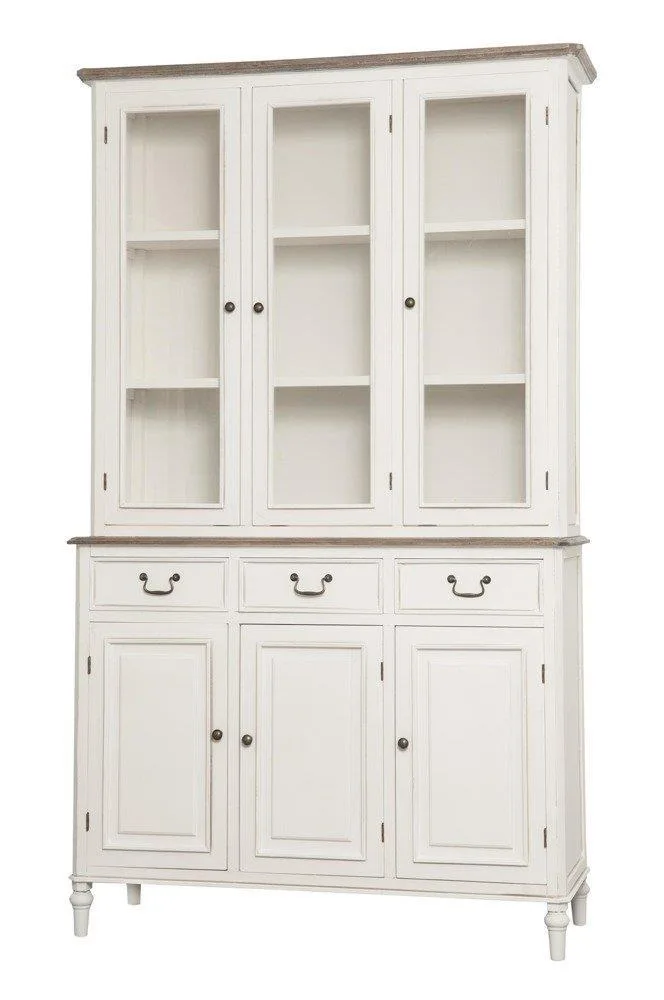 Ravenna RA08 vitriinkapp söögituppa. See elegantne Provencal stiilis vitriinkapp on ideaalne täiendus igasse söögituppa, pakkudes nii praktilisust kui ka esteetilist ilu. Valge värvusega kapp on kaunistatud tumeda pruuni pealispinna ja ülemise äärega, mis lisavad sellele ajatut võlu. Metallist käepidemed ja rullitud jalad annavad mööbliesemele täiendava stiilse aktsendi.