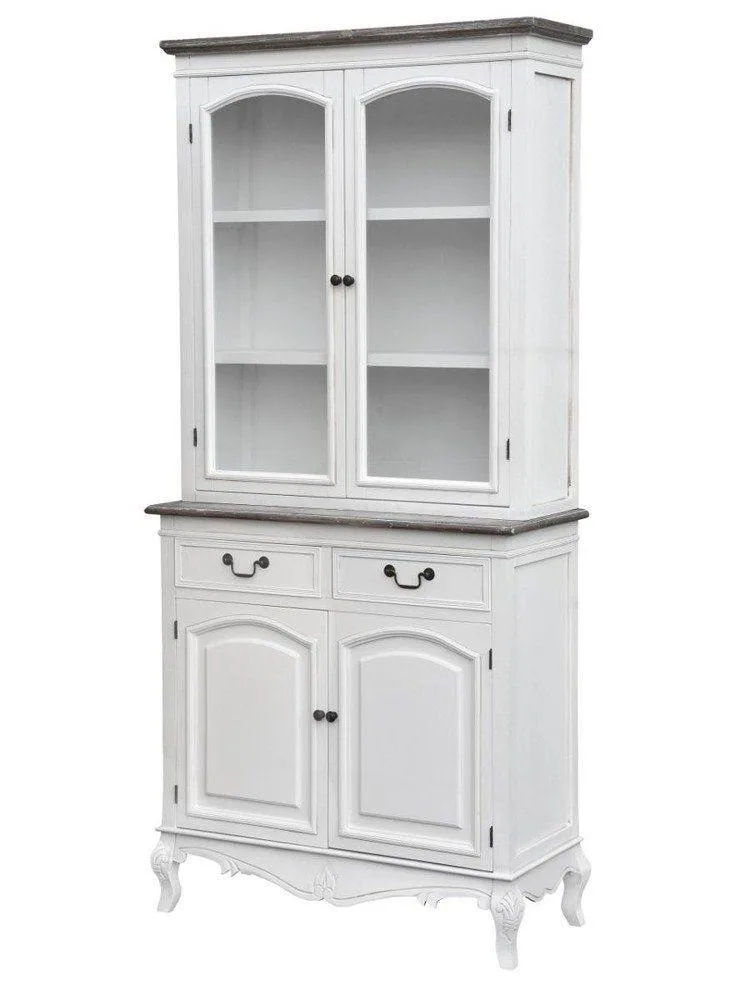 Rimini White RIW01 vitriinkapp söögituppa. See elegantne Provencal stiilis vitriinkapp lisab teie söögituppa klassikalist võlu. Valged nikerdused ja tumedast pruunist puitu pealispind koos ülemise karniisiga loovad harmoonilise ja ajatu välimuse. Metallist käepidemed ja kaardus jalad lisavad sellele mööbliesemele unikaalsust ja stiili.