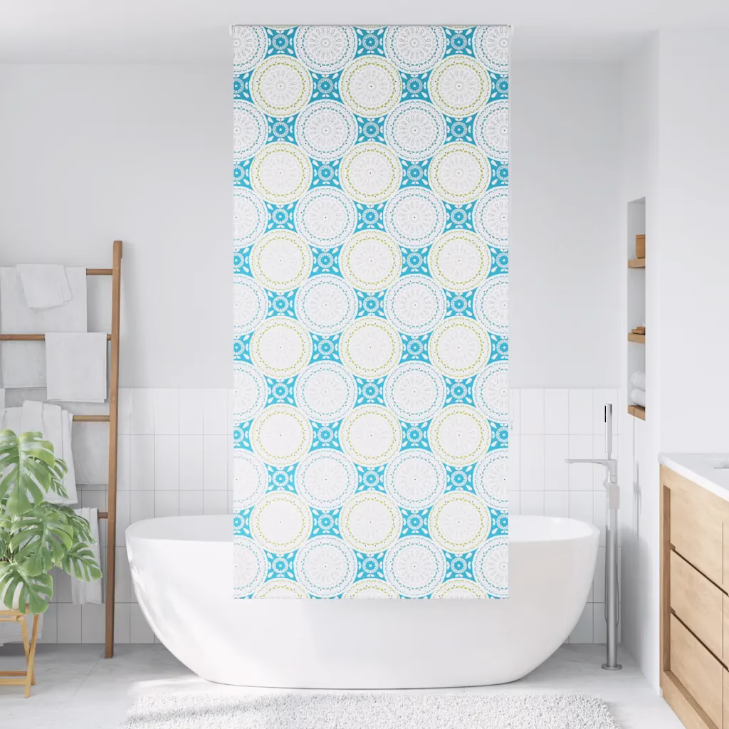 See ornamentmustriga sinine duširull-ruloo ühendab privaatsuse, veekindluse ja paindlikud paigaldusvõimalused. Kui soovite vannituppa praktilist ja samas dekoratiivset lahendust, mis hoiab ruumi kuivemana ja korrastatumana, on see ruloosüsteem hästi sobiv valik.