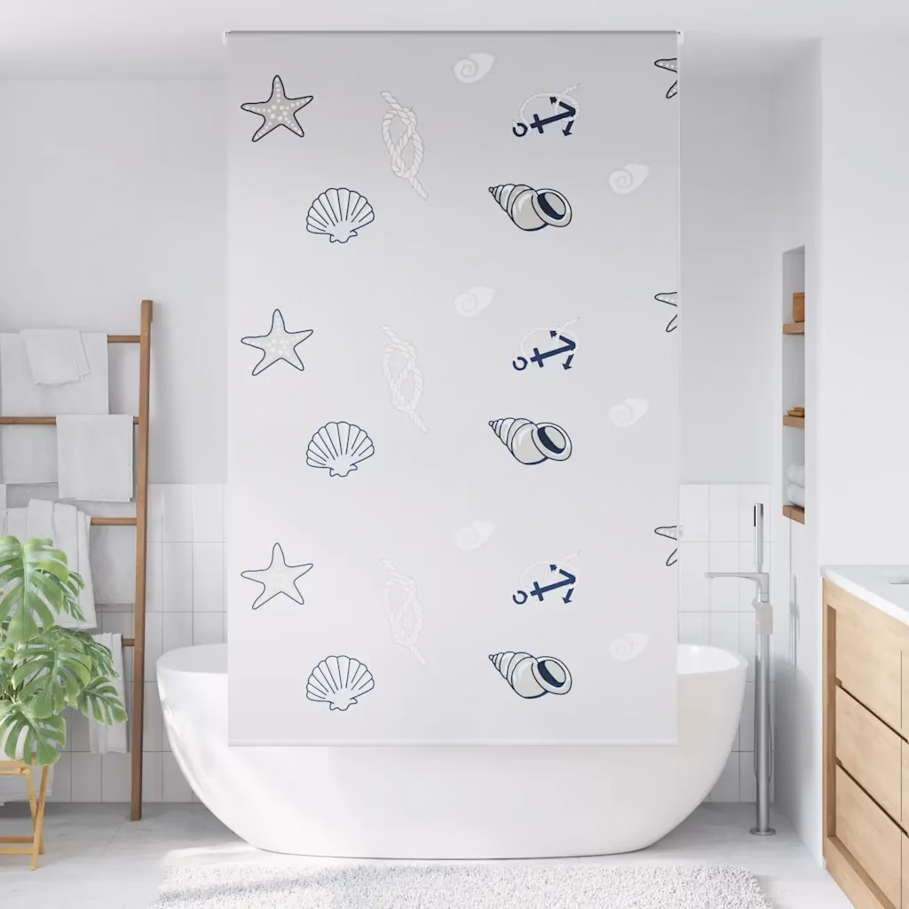 See hall meretähe mustriga duširuloo aitab hoida vannitoa põranda kuivana ja pakub duši all käies vajaliku privaatsuse. Veekindel PEVA materjal ja ruumi säästev ruloo-mehhanism muudavad selle praktiliseks lahenduseks nii väiksematesse kui ka suurematesse vannitubadesse.