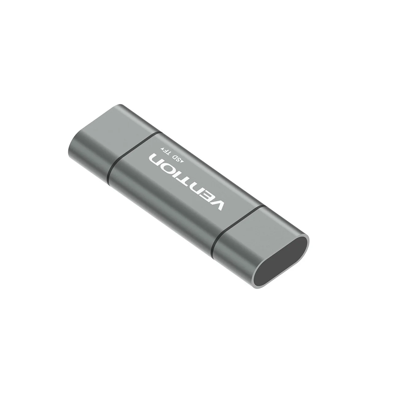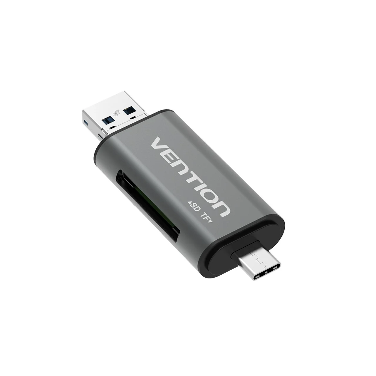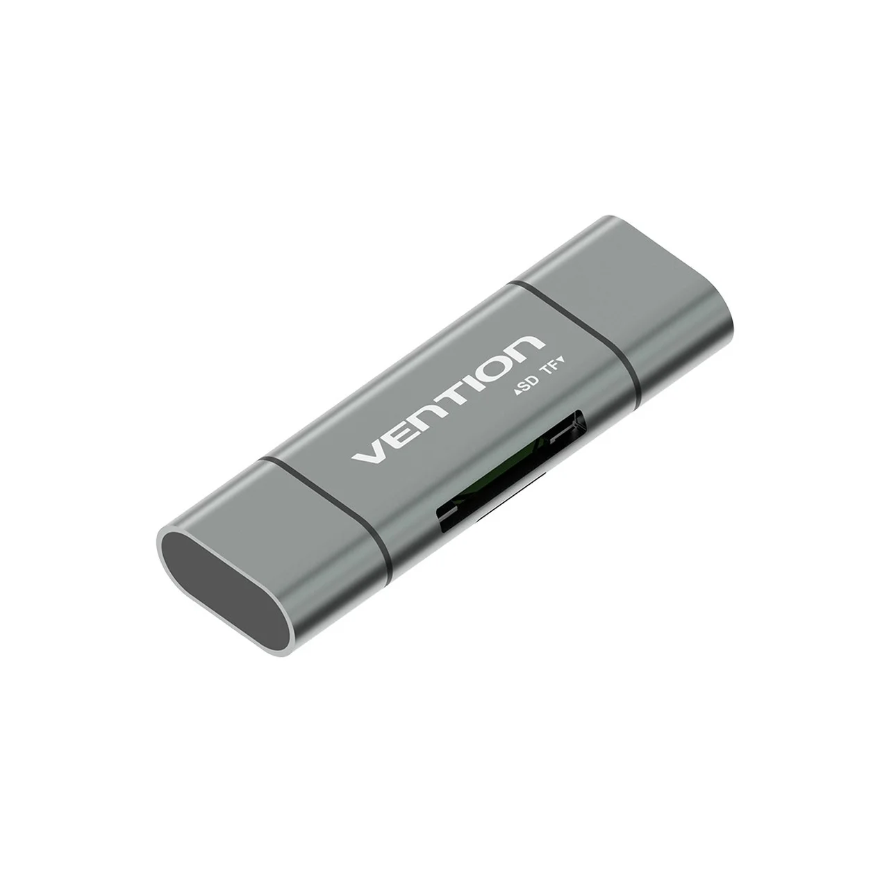 Ventioni hall USB 3.0 kaardilugeja alumiiniumkorpuses võimaldab kiiret andmeedastust SD- ja MicroSD-kaartidega ning on varustatud USB-A, USB-C ja Micro-USB liidestega.
