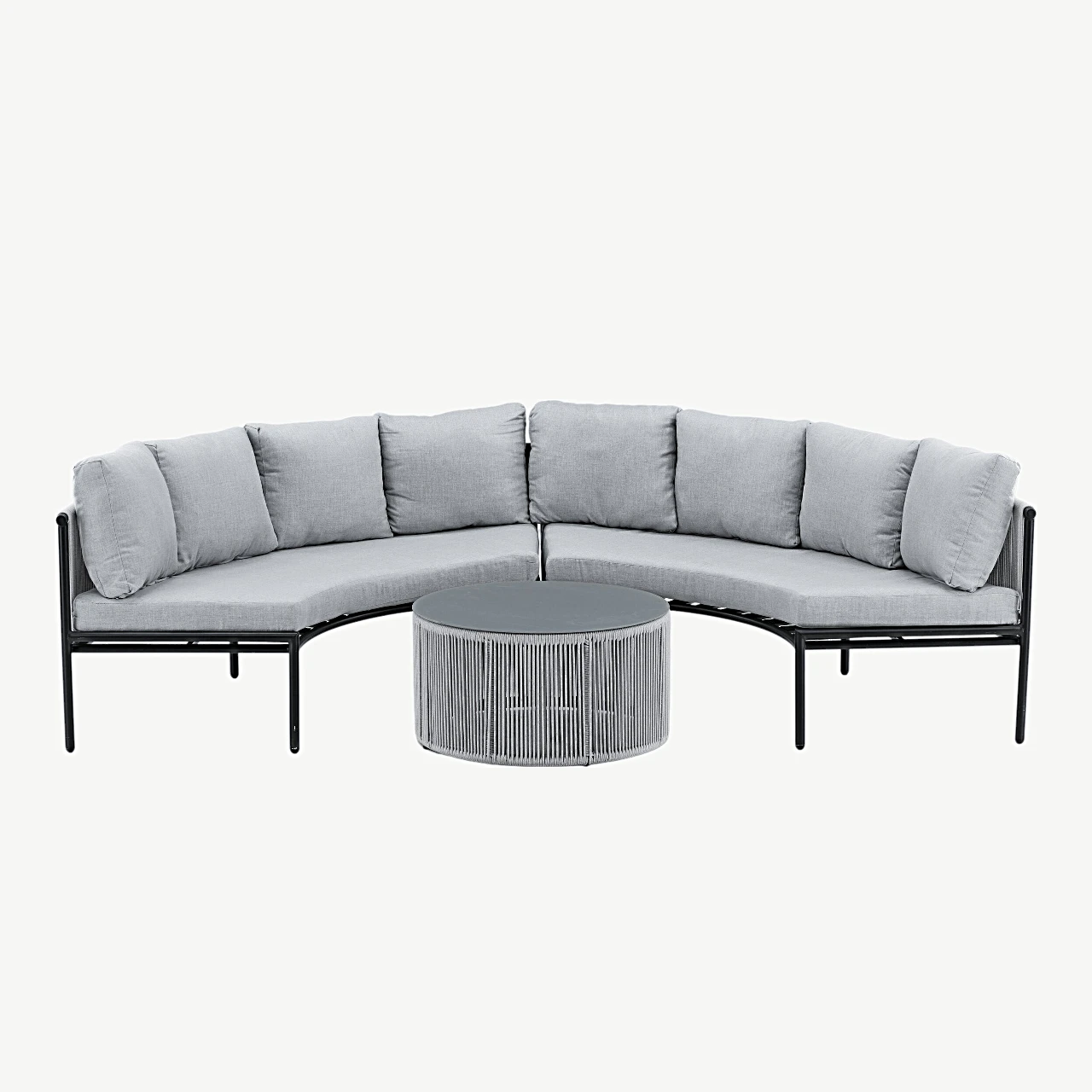 Virya poolkaarekujuline nurgadiivani komplekt pakub Sinu terrassile või aeda ajatu põhjamaise stiili ja tõelist mugavust. Minimalistlik ja kaunis hall poolkaarekujuline õuediivan ühendab modernsed materjalid ning lihtsasti hooldatava viimistluse. Komplekti kuulub ka ümmargune kohvilaud (⌀70 cm), mis sobitub suurepäraselt istumisnurga kõrvale ning võimaldab nautida lõõgastavaid hetki koos pere ja sõpradega. Diivanil on pehmed, hallid istme- ja seljatoepadjad, mis loovad veelgi rohkem istumismugavust.
