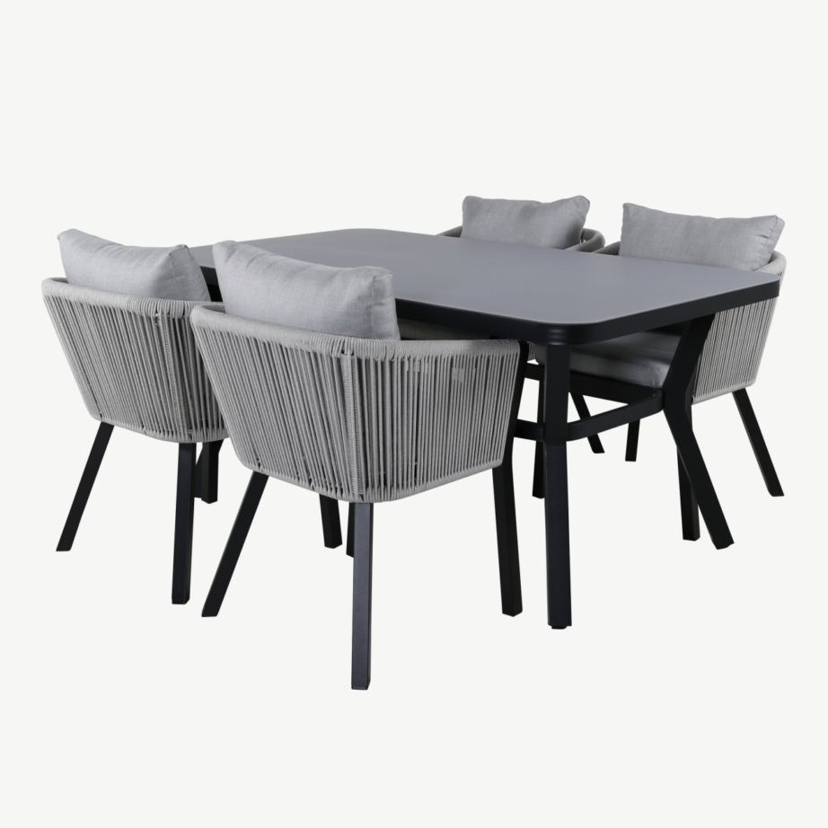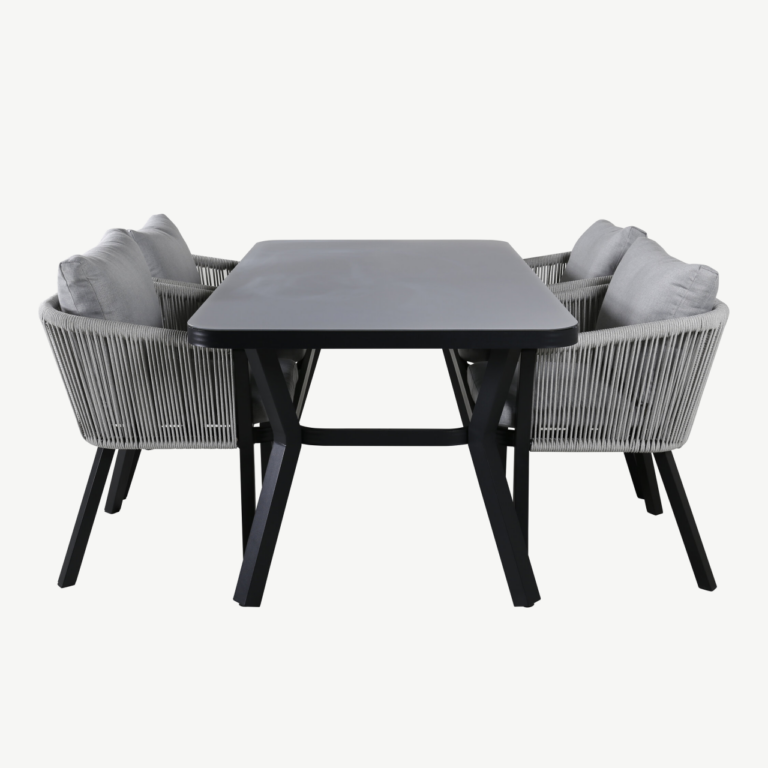 Virya aiasöögikomplekt on ideaalne valik, kui väärtustad kaasaegset põhjamaist disaini, vastupidavaid materjale ja maksimaalset mugavust. Komplekt koosneb elegantsest musta alumiiniumraamiga ristkülikukujulisest lauast ning neljast köispunusega toolist, mille juurde kuuluvad hallid polüesterkattega istme- ja seljatoepadjad. See must aiasöögikomplekt köistoolidega rikastab Sinu terrassi, aeda või rõdu isikupärase ja puhta esteetikaga.