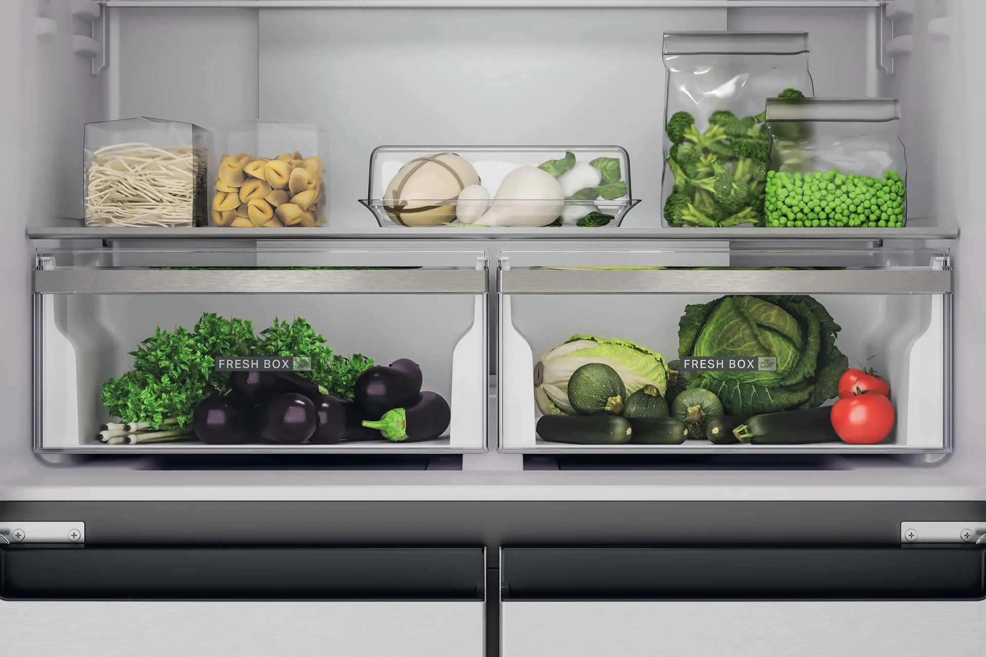- Mitmekülgsed sahtlid ja reguleeritavad riiulid köögiviljadele ja teistele toiduainetele
