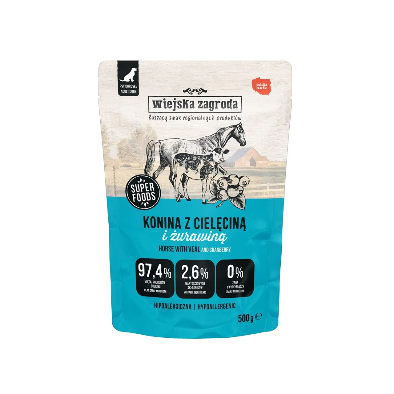 Wiejska Zagroda hobuseliha märg koeratoit paistab silma looduslike koostisosade, suure lihasisalduse, puhta retsepti ja allergikutele sobivate omaduste poolest. Tänu teravilja-, gluteeni- ja sojavabale koostisele ning kanaliha puudumisele sobib see eriti hästi tundliku seedimisega koertele. Mugav pakend teeb kasutamise ja säilitamise lihtsaks, kvaliteetne koostis tagab toiteväärtuse ning koera pikaajalise heaolu.