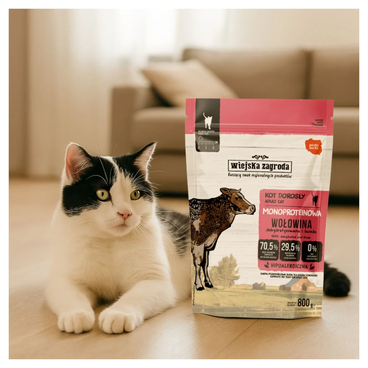 Wiejska Zagroda Monoprotein Beef on täissööt kuivtoit, mis on loodud spetsiaalselt täiskasvanud kassidele, kellel on toidutundlikkus, allergiad või tundlik seedimine. Selle monoproteiiniline koostis – ainsa loomse valguallikana on kasutatud veiseliha – sobib eriti hästi kassidele, kellel esineb toiduallergiat või -talumatust. Toode on täielikult gluteeni- ja teraviljavaba ning ei sisalda kunstlikke värvaineid, soja ega suhkrut, aidates vähendada allergia ning seedimise häirete riski ja toetada üldist tervist.