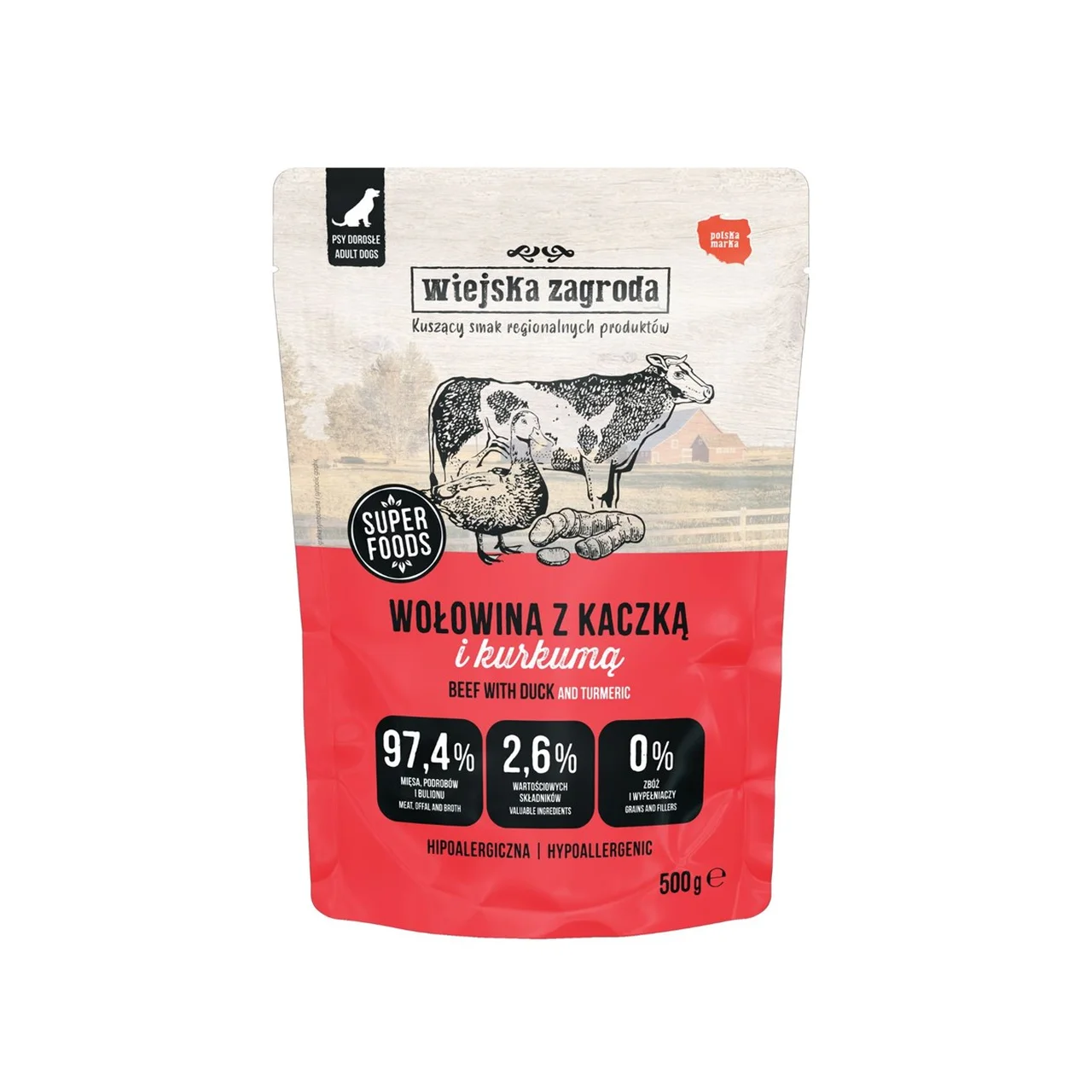 Wiejska Zagroda Beef with Duck on kvaliteetne ja täisväärtuslik märgtoit täiskasvanud koertele, sobides igas suuruses ja tõust lemmikutele. Selle toidu põhikomponentideks on veiseliha ja pardiliha, mis pakuvad maitserikast ning toitvat einevalikut ka kõige tundlikumale koerale. Tänu spetsiaalsele koostisele – teravilja-, gluteeni-, kana- ja sojavaba – sobib see eriti hästi allergilistele ning toidu ülitundlikkusega koertele, samas toetades lihaste arengut ja üldist tervist.