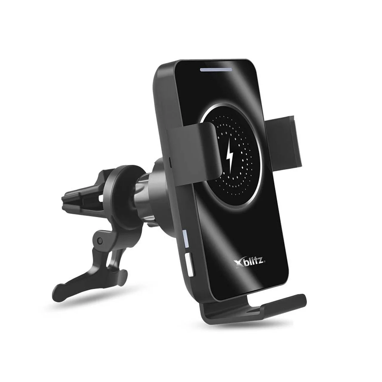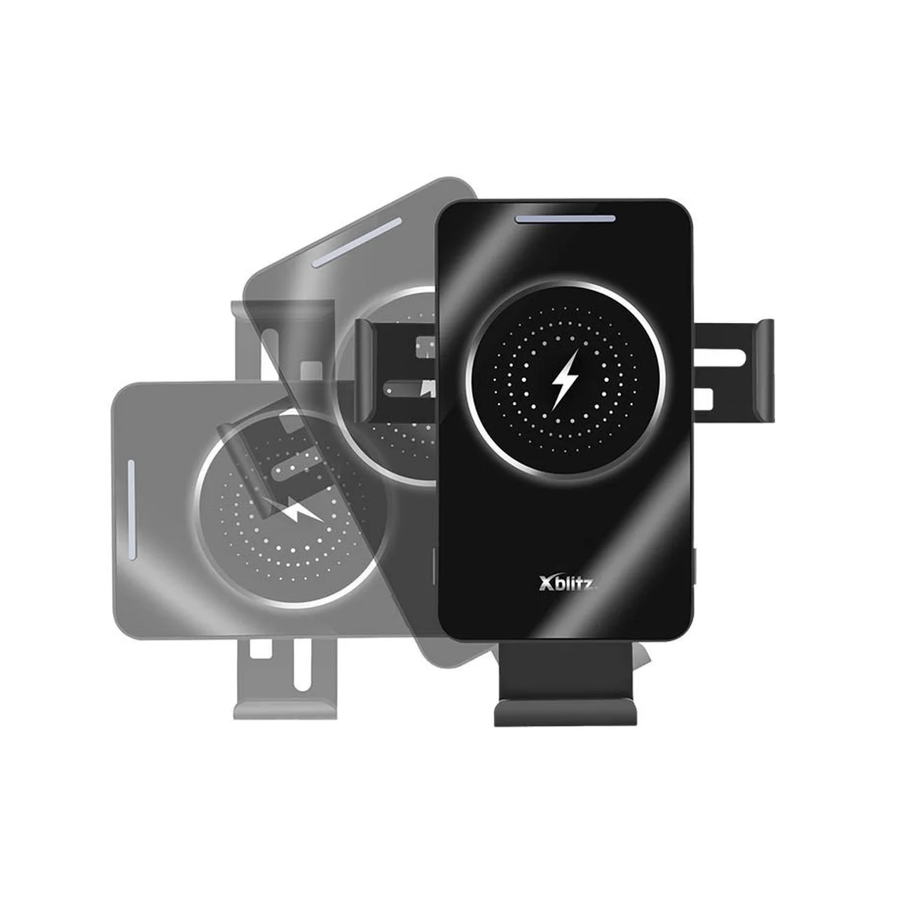 Xblitz GX4 on musta ja hõbedase disainiga autotelefoni hoidik, mis võimaldab 90° pööramist ja 15W juhtmevaba laadimist ventilaatori või iminapa abil kinnitamiseks.