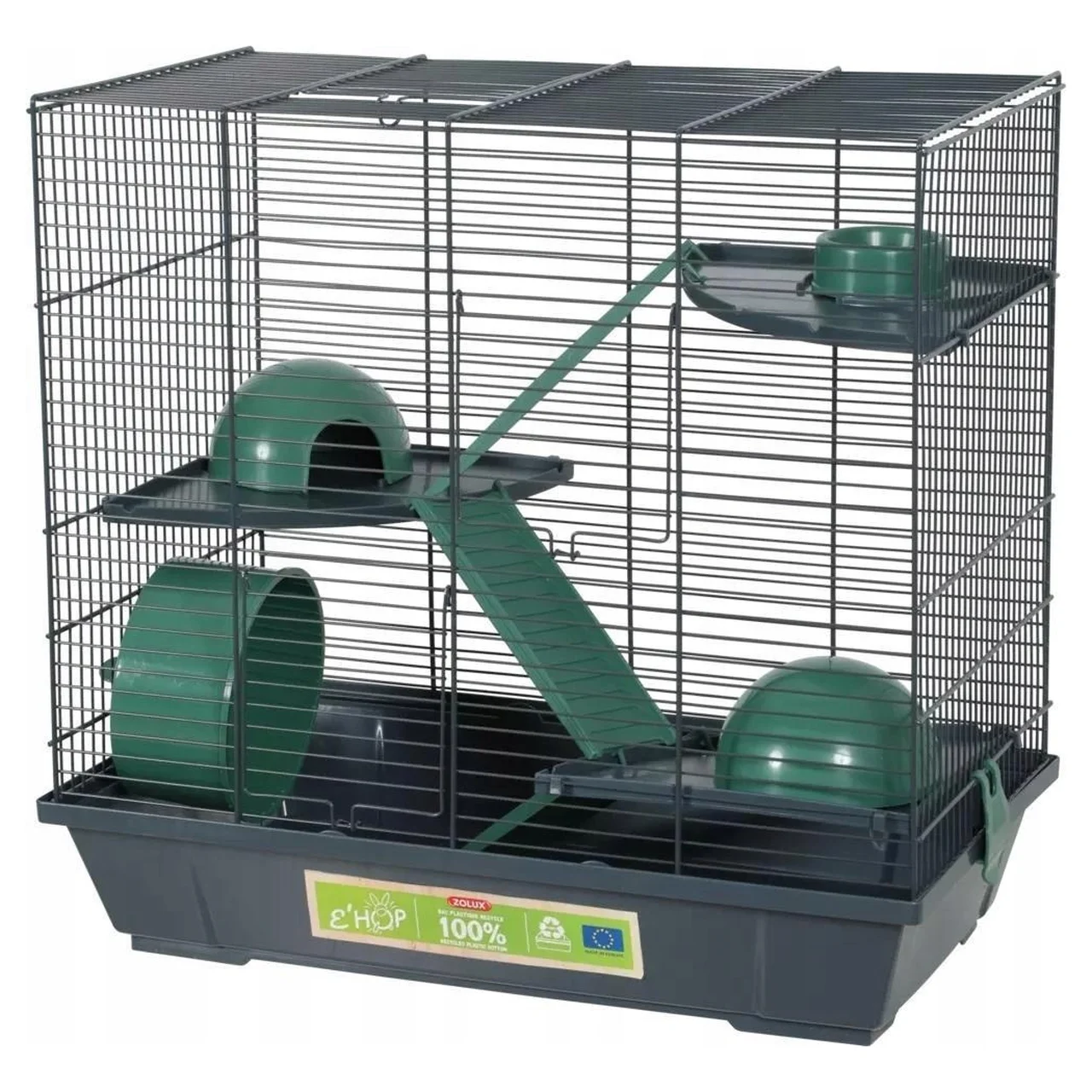 Zolux EHOP on kaasaegne ja vastupidav 3-tasandiline hamstripuur, mis on loodud pakkuma teie lemmikloomale ohutut, avarat ning mitmekülgsete tegevusvõimalustega elukeskkonda. Rohelise ja halli värvitooniga puuri tootmisel on kasutatud kvaliteetset metalli ja 100% taaskasutatud plastikut, mis teeb selle sobivaks ka keskkonnateadlikule omanikule. Puur on spetsiaalselt disainitud hamstritele ja teistele väikeloomadele – mitmetasandiline lahendus, jooksuratas ja tarvikud loovad ergutava ja turvalise kodu aktiivsele närilisele.